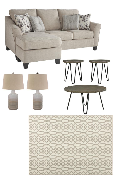 Benchcraft® Abney Driftwood Sofa ChaiseSignature Design by Ashley® Hadasky Set of 3 Two-tone Occasional Table SetSignature Design by Ashley® Marnina Set of 2 Taupe Table LampsSignature Design by Ashley® Coulee Natural 5' x 7' Medium Area RugRead More