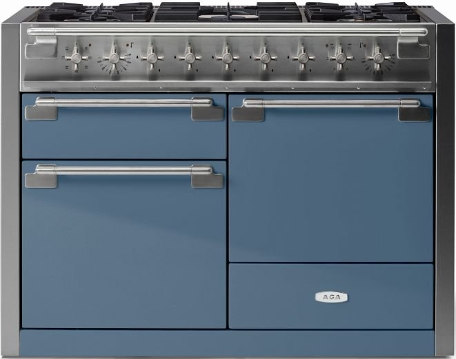 The AGA Elise 48" Dual Fuel Model features three separate ovens. The first is an electric multifunction oven with seven settings including true European dual-convection cooking, fan-assisted baking, browning, thaw and serve, convection broiling, warming, and conventional cooking. A second European convection oven offers the ability to cook multiple large dishes at once using differing heating modes and temperatures, while a third dedicated glide-out broil oven allows for dedicated top-heat broiling. A continuous cast-iron cooktop features five powerful sealed-brass burners providing easy cleanup and preventing messy spills from reaching the oven or internal components. A storage drawer stores extra racks and trays.