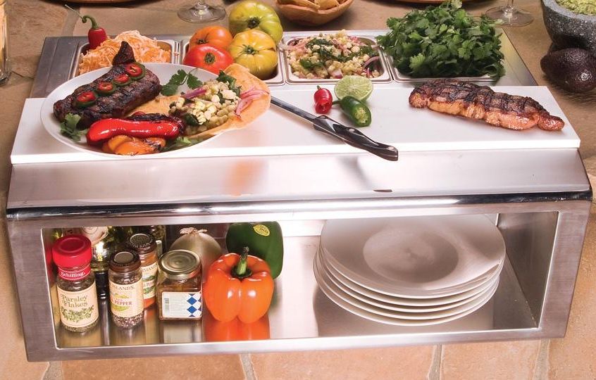 Restaurant inspired plating station with food pans, carving board and plate storage below.