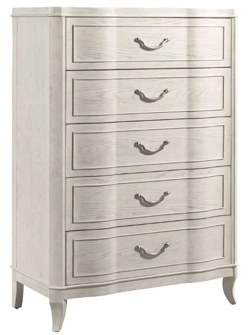 Complete your bedroom ensemble with this elegantly designed drawer chest. It is constructed of cathedral white oak veneers in an Eggshell finish, and comes equipped with dividers in the second and third drawers, cedar lined bottom drawer, adjustable levelers, and hand holds in back of case for easy mobility.Read More