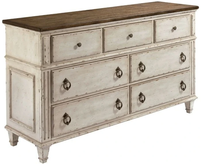 Reminiscent of a cottage in the European countryside, the Southbury furniture collection is both charming and elegant. Its inspiration comes from the gracefully aged painted antiques of a previous era. The personality of Southbury with oak veneers is captured in the finish where handwork and an artistic eye create the parchment finish on the fronts and end panels while the tops are treated to a contrasting fossil tone finish. Design elements from French and Italian influences not onlyandnbsp;add character, they also make the furniture right at home in both a traditional and casual bedroom, dining room, or living room spaces. Founded in 1927, American Drew is a well-established, leading manufacturer of mid-priced bedroom, dining room, and living room furniture.