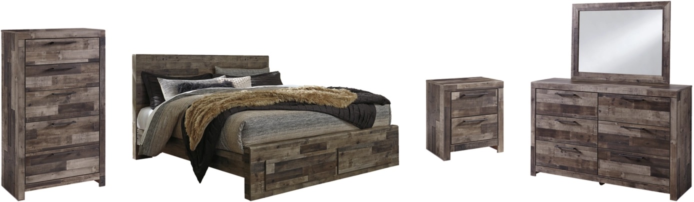 Includes panel bed with storage (headboard, 2-drawer storage footboard, rails and slats), 6-drawer dresser with mirror, 5-drawer chest, and 2-drawer nightstand