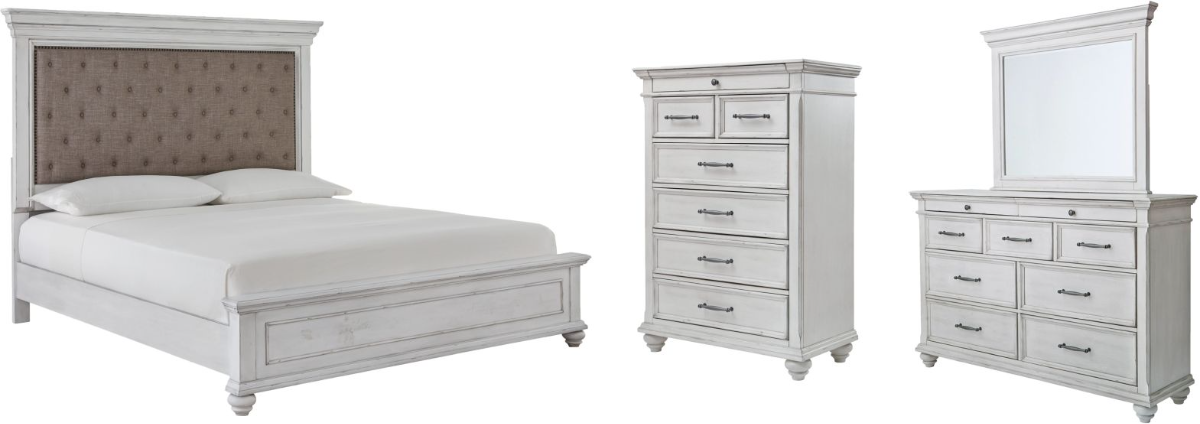 Give your retreat vintage charm with this bedroom set in a beautifully distressed white-washed finish. You'll love the headboard's grand style featuring an inset button-tufted upholstery cushion. Generously scaled moulding, framed drawer fronts, nailhead trim and bun feet enhance the character of this bedroom set—evoking the feel of a quaint cottage escape.Read More