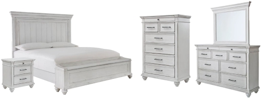 Includes queen panel bed (headboard, storage bench footboard and rails), dresser with mirror, chest and nightstand