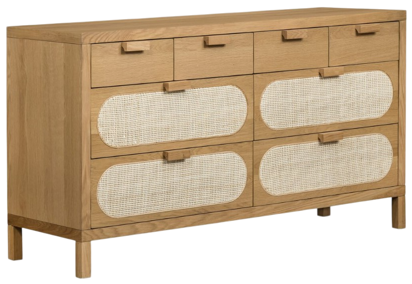 The Four Hands Allegra Honey Oak/White 8-Drawer Dresser features a honey-finished oak frame with wood-backed cane paneling on its spacious drawers. This design creates a soft, neutral aesthetic, blending natural textures with a refined, timeless appeal.Read More