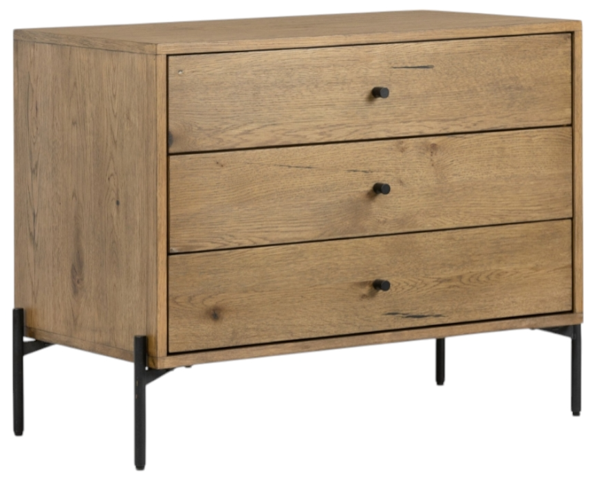 Clean and streamlined. Amber-finished oak features three large drawers plus gunmetal-finished hardware, for a look that's always in style. Dark resin plays up woods' natural graining. And this will be a great fit into your home.Read More