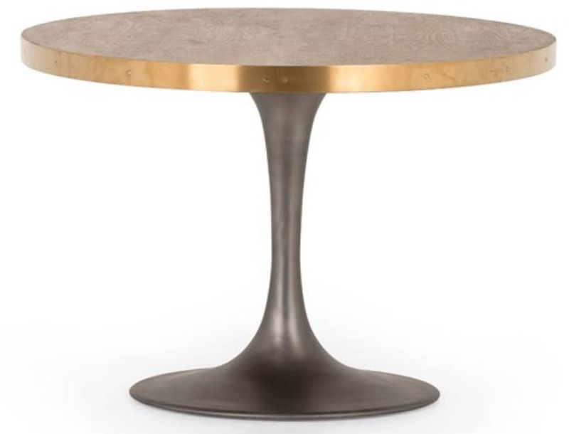 Mixed materials make the table. Classic tulip shaping is recast with a vessel grey iron base and a light, burnt oak oval top banded in polished brass steel with exposed nailheads. Seats eight comfortably.Read More