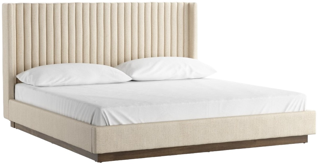 A tall, vertical-channeled headboard is upholstered in cream high-performance fabric for a sensible take on modern bedroom styling. A Parawood plinth base grounds the whole look. Performance fabrics are specially created to withstand spills, stains, high traffic, and wear, ensuring long-term comfort and unmatched durability.Read More
