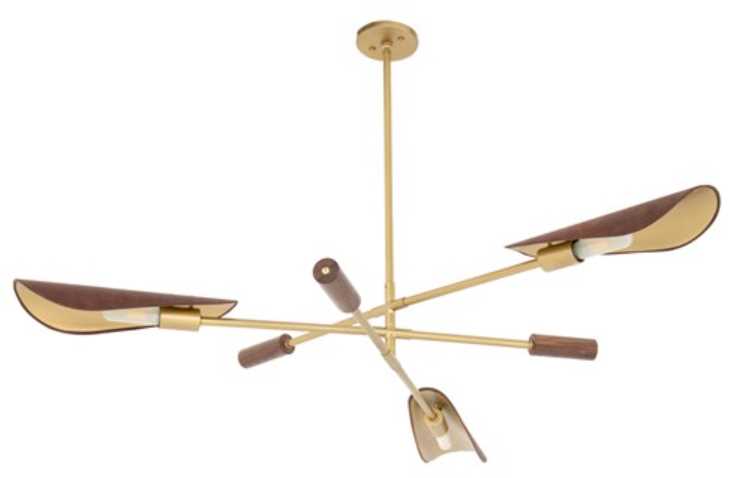 Switch on style. Finished in antique brass, steel tubes sleekly intersect, with decorative walnut veneer tips and brown top-grain leather shades with brass pin detailing for a forward-thinking material mix. Includes T10 LED bulbs plus additional piping for adjustability from 27" to a maximum hanging length of 51".Read More