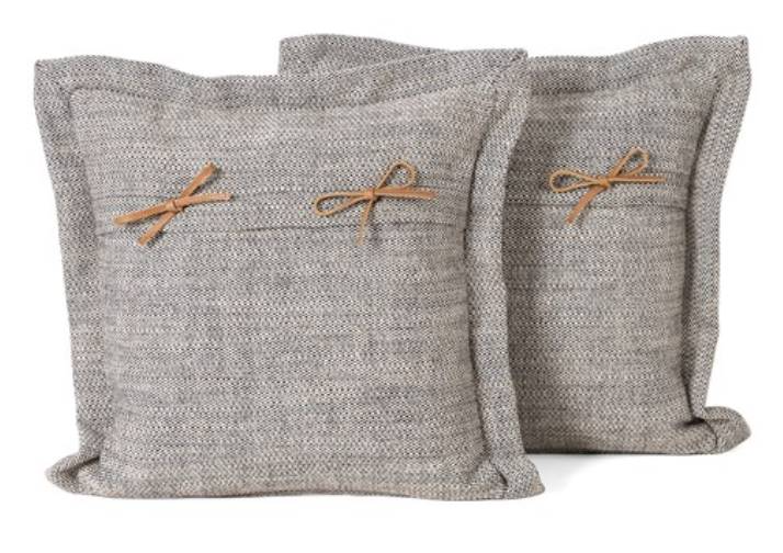 With luxurious feather-blend inserts, a set of grey linen-blend throw pillows features decorative top-grain leather ties for a charming material mix with soft texture. Elevate your room decor with these pillows from Four Hands.Read More