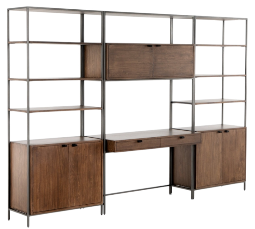 A mid-century-inspired design, greyish auburn poplar and raw iron fuse for a forward-thinking two-piece bookcase with modular capabilities, featuring generous storage space by way of open shelving, concealed cabinetry and dual drawers. Metalsecured pulls of top-grain leather add a fresh element of surprise.Read More