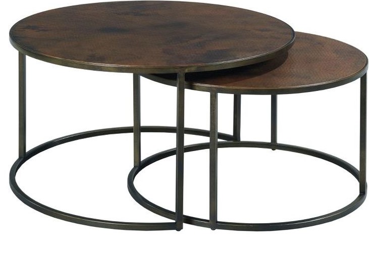 The Sanford living room group features hammered copper tops and metal bases. This Round Nesting Cocktail table includes a smaller table with a diameter of 30" and a height of 17.5".Read More