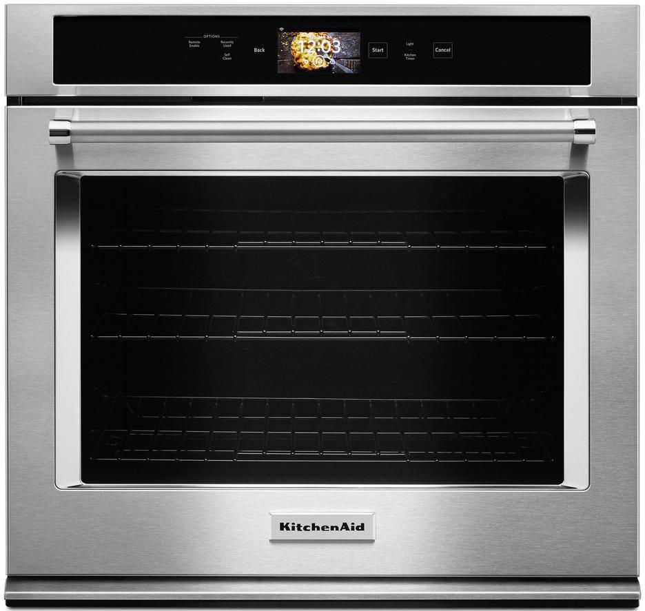 Open up new culinary possibilities. KitchenAid introduces the first single wall oven that comes with interchangeable attachments in the tradition of the iconic KitchenAid® Stand Mixer to enable grilling, stone cooking and steaming. As cooks expect today from a premium wall oven, it also supports a full complement of smart capabilities as well as baking, broiling and Even-Heat™ True Convection.Read More