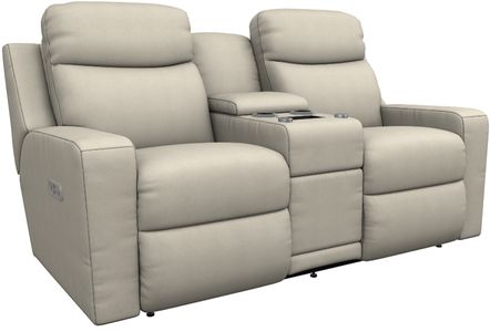 The Emmons Reclining Loveseat with Headrest, Lumbar and Console is cool, cozy, and handy. Track arms and exposed wings add bold style. Soft backs and sleek chaise seats offer head-to-toe adjustable comfort. Cups, remotes, and relaxation are in reach.Read More