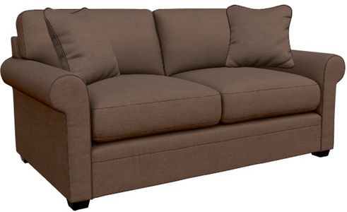 Rolled arms, decorative wood legs and welt trim lend laid-back refined style