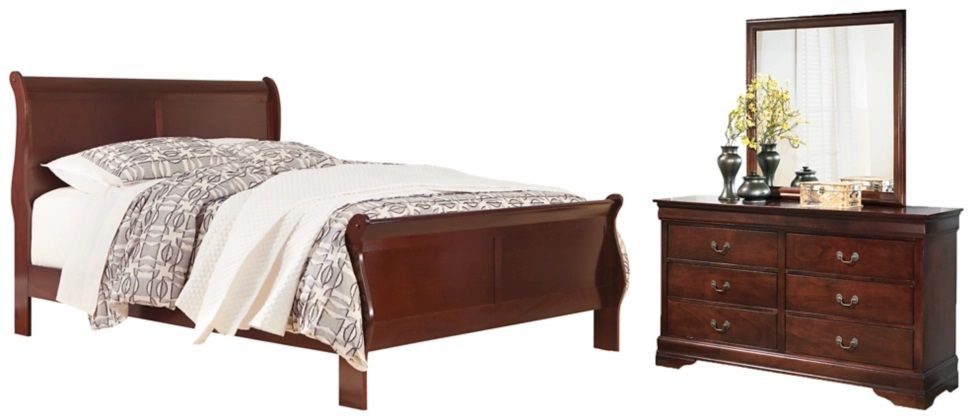 Includes California king sleigh bed (with headboard/footboard and rails) and dresser with mirror