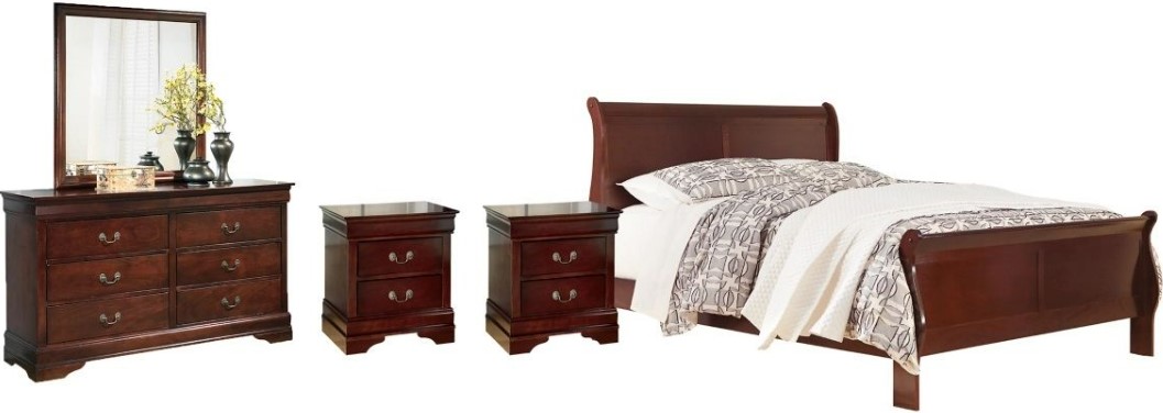 Includes California king sleigh bed (with headboard/footboard and rails), 6-drawer dresser with mirror, and two 2-drawer nightstands