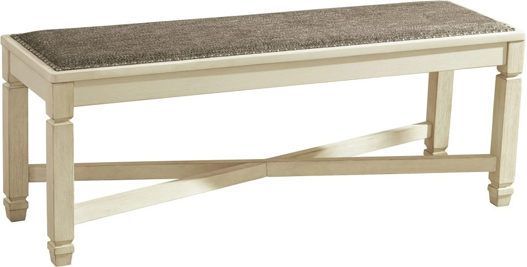 The beauty of this upholstered dining bench is something to savor. Serving up comfort and flair, this generously scaled bench entices with a cushioned seat covered in a heavy woven fabric that complements the antiqued white finish.Read More