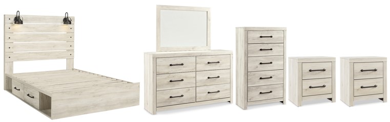 Includes queen panel storage bed (headboard, footboard, side storage, rails and slats), 6-drawer dresser with mirror, 5-drawer chest and two 2-drawer nightstands