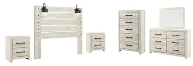 Includes queen panel headboard, 6-drawer dresser with mirror, 5-drawer chest and two 2-drawer nightstands