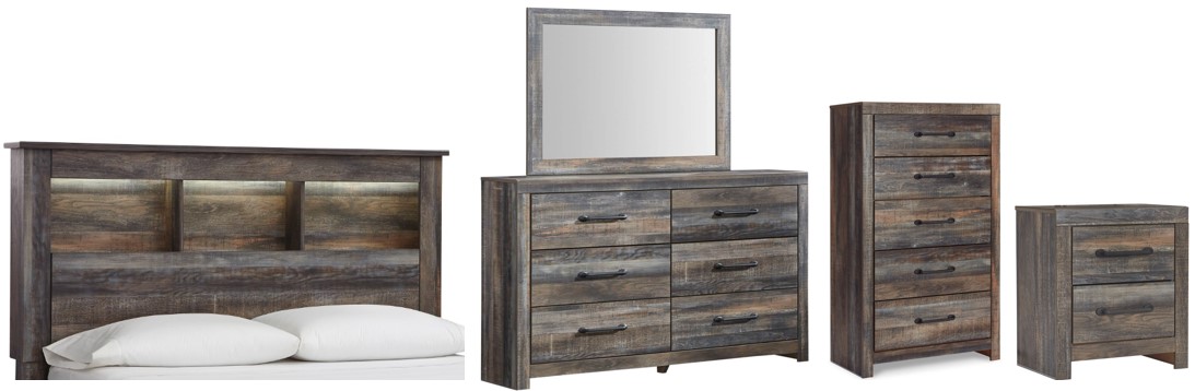 Includes king/california king bookcase headboard, 6-drawer dresser with mirror, 5-drawer chest and two 2-drawer nightstands
