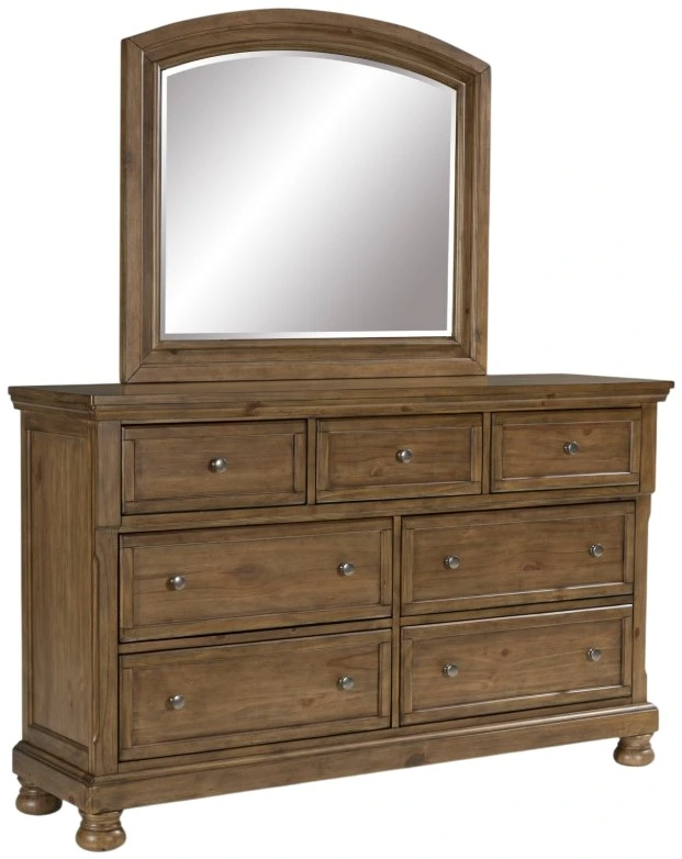 A relaxed take on casual traditional design, this dresser with mirror strikes a comfy pose with a classic sensibility. Its timeless design and chestnut brown wood tone create a welcoming retreat tailored to your laid-back lifestyle. Metal knobs in an aged pewter color subtly dress up drawers packed with storage possibilities.Read More