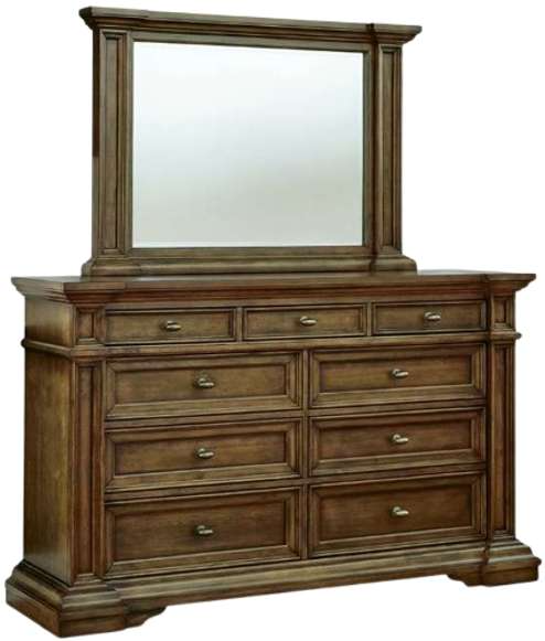 Time-honored style, made for today's home. This dresser and mirror pay homage to traditional aesthetics, with a richly detailed finish incorporating a sense of stately elegance. Substantially-scaled moulding details and antiqued brass-tone knobs round out the piece in graceful fashion.Read More