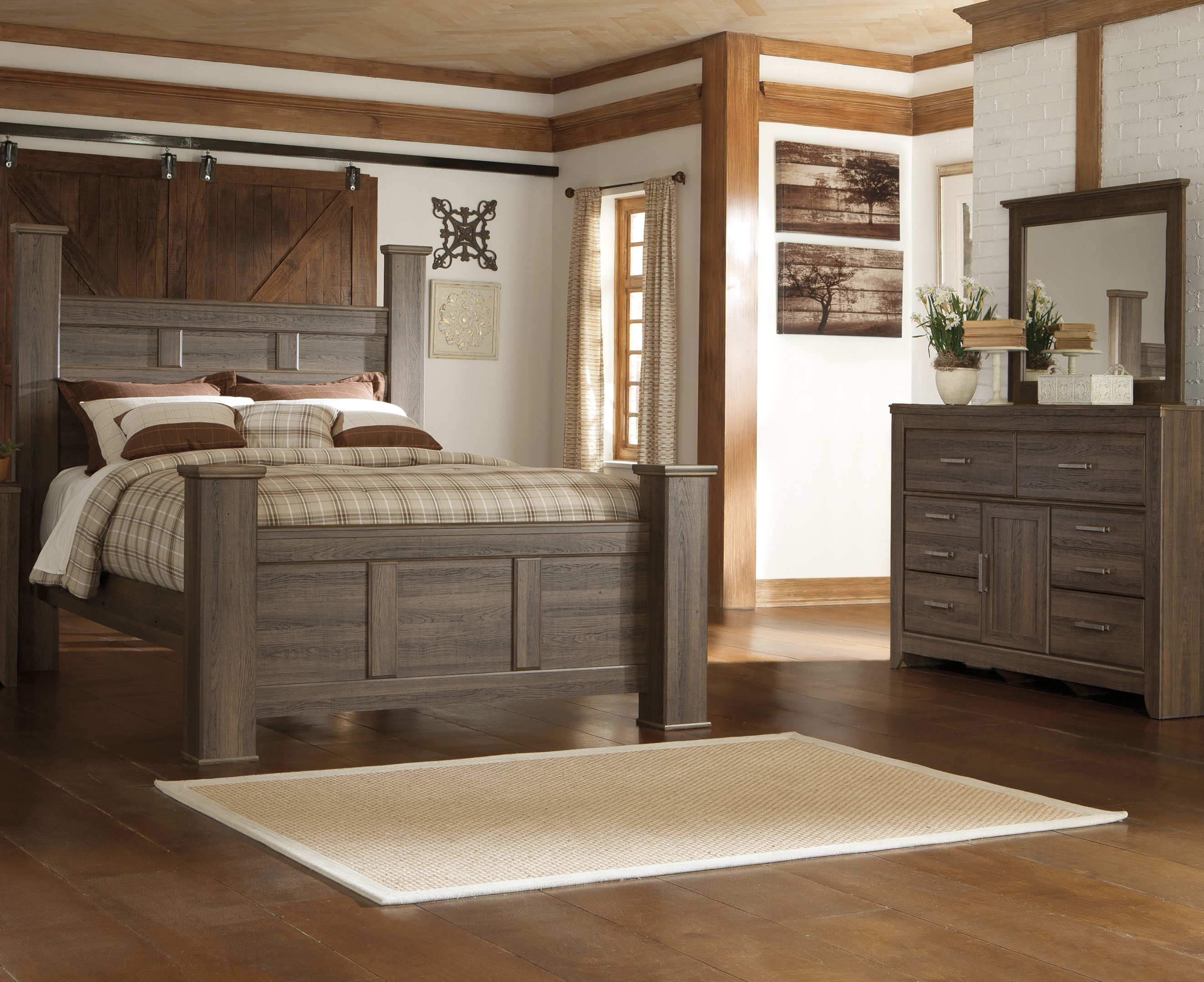 Includes - King Poster Bed (headboard, footboard, and rails), Dresser, and Mirror