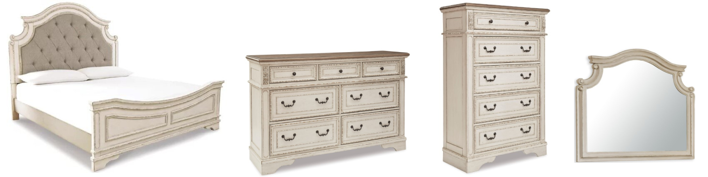 Includes bed (with upholstered headboard, footboard and rails), dresser with mirror and chest, Bed made of wood and engineered wood with distressed, chipped white finish, Polyester upholstery with foam cushion and button tufting, Dresser and chest made of veneers, wood and engineered wood, with cast resin components, Dresser and chest with antiqued two-tone finish, Dresser with 6 drawers (top drawers felt lined), Mirror attaches to back of dresser, Chest with 5 drawers (top drawer felt lined), Drawers with dovetail construction, Dark bronze-tone metal hardware, Assembly required, Foundation/box spring required, sold separately, Mattress available, sold separately