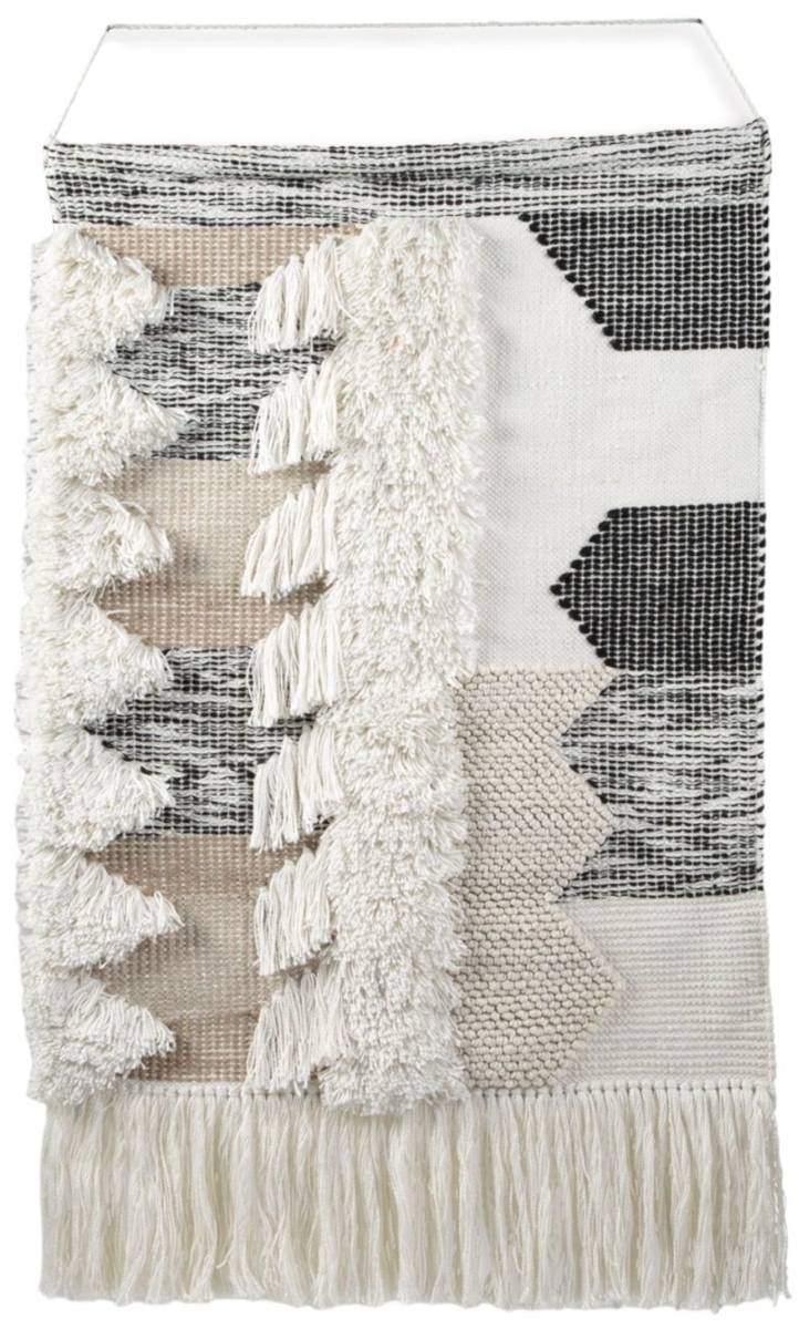 The Taylen wall décor features an eclectic woven motif of black, gray, and natural polyester with braided cord for easy wall hanging.