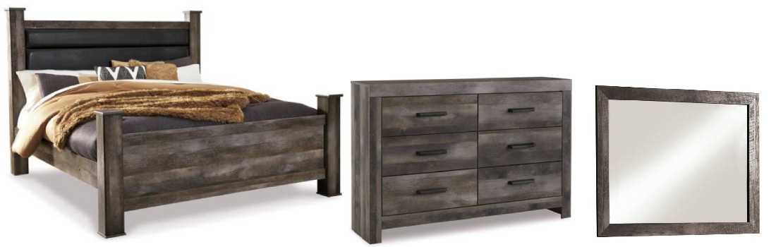Includes king poster bed (black faux leather upholstered poster headboard, poster footboard, posts and rails), dresser and mirror