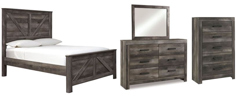 Includes crossbuck panel bed (headboard, footboard and rails), 6-drawer dresser with mirror and 5-drawer chest
