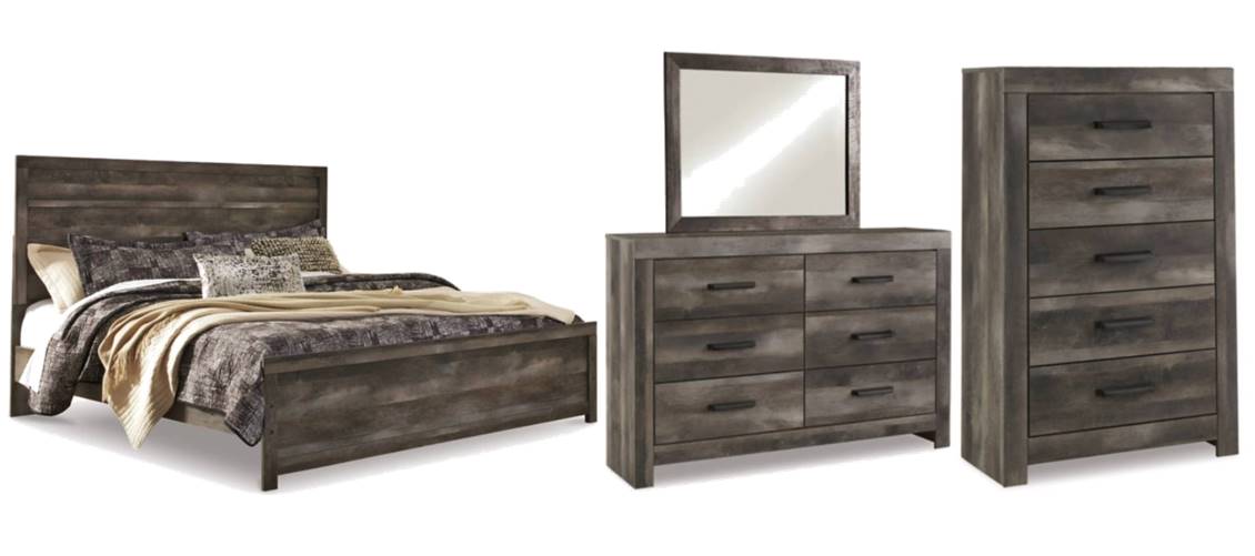 Includes panel bed (headboard, footboard and rails), 6-drawer dresser with mirror and 5-drawer chest.